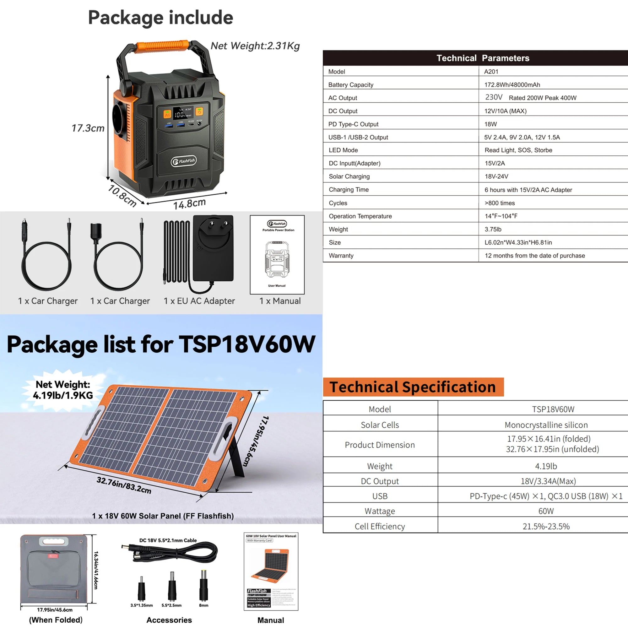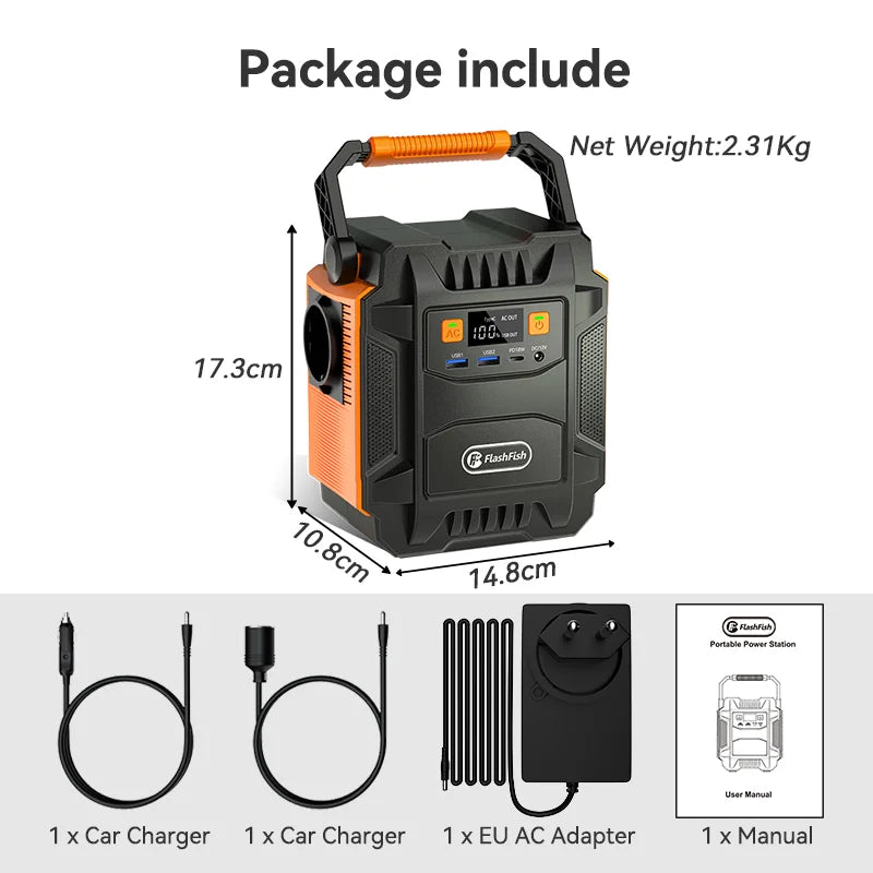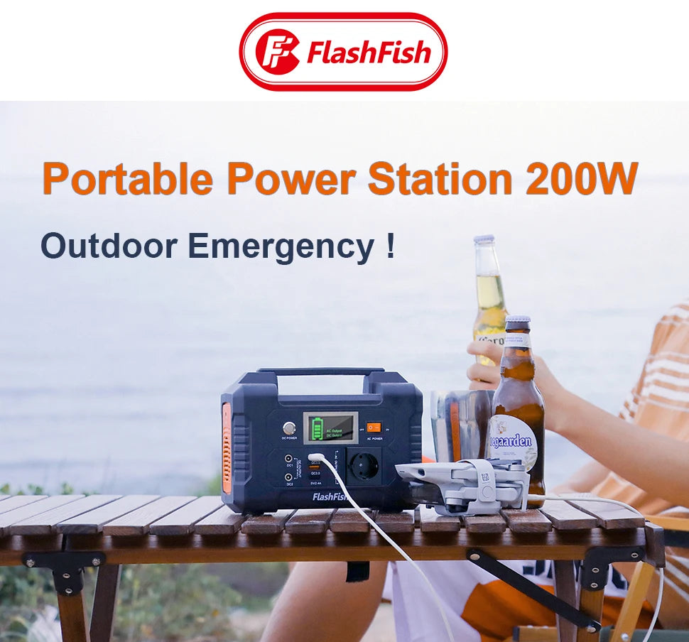 Flashfish portable power station EA200 is designed for outdoor activities' power supply. Small size (5.6lbs, 8.2x4.3x6.2 inch) with big capacity (151Wh), the most portable all-in-one power station can fulfill your demand for camping or emergency.