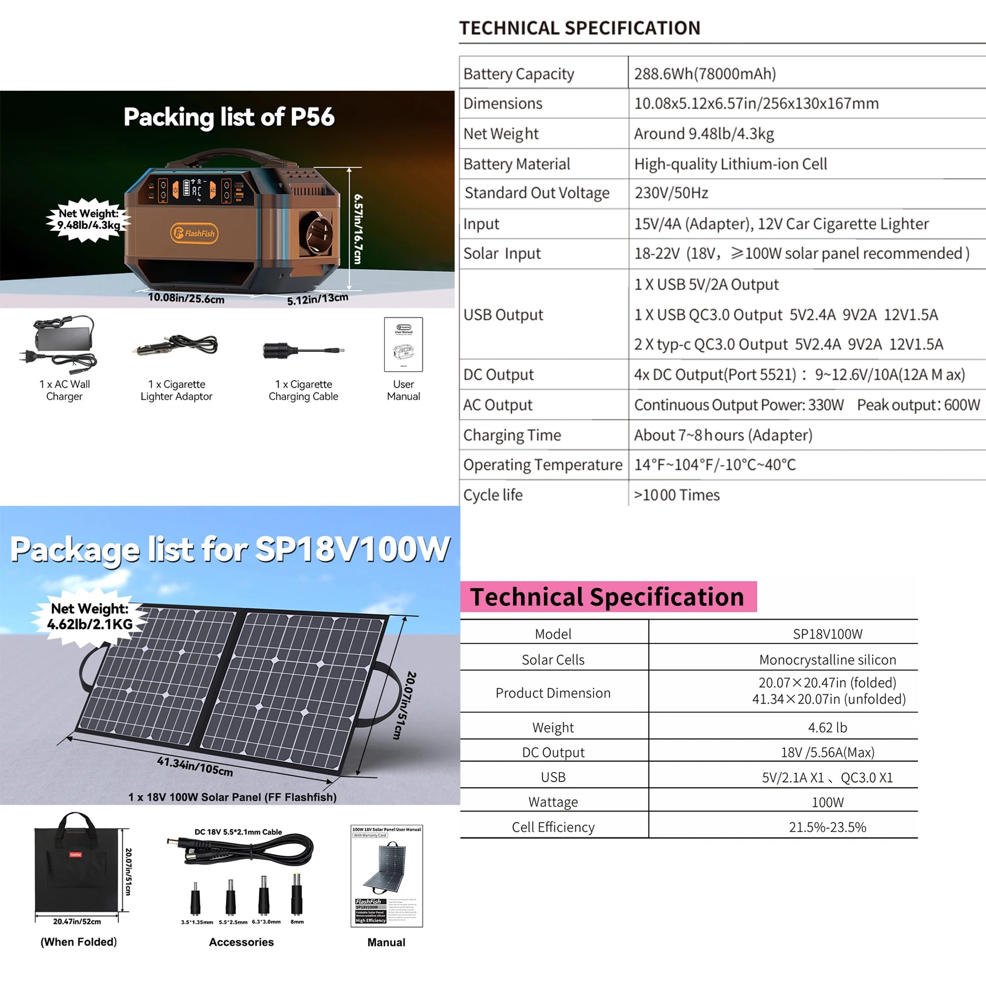 FlashFish power station is equipped with a lithium battery pack, it can be charged by the 15-24 volt solar panel (not included), AC wall adapter and car charger efficiently. No memory effect, no worry about battery capacity reduction.