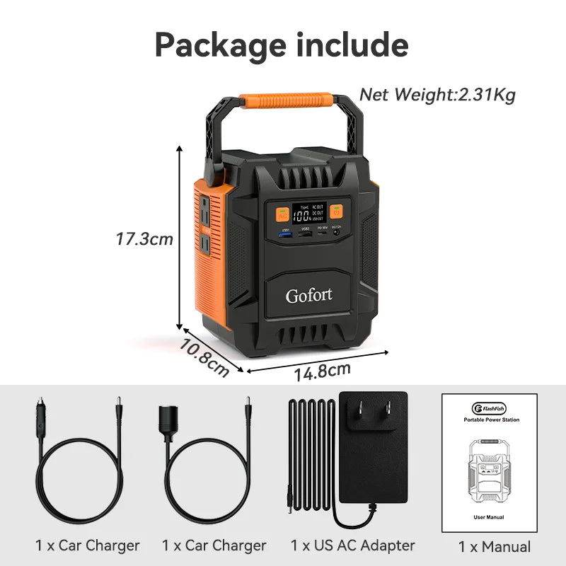 Package List: 1*Portable Solar Generator 1*Power Adapter 1*Cigarette Lighter Adapter 1*Car Charger 1*User Manual