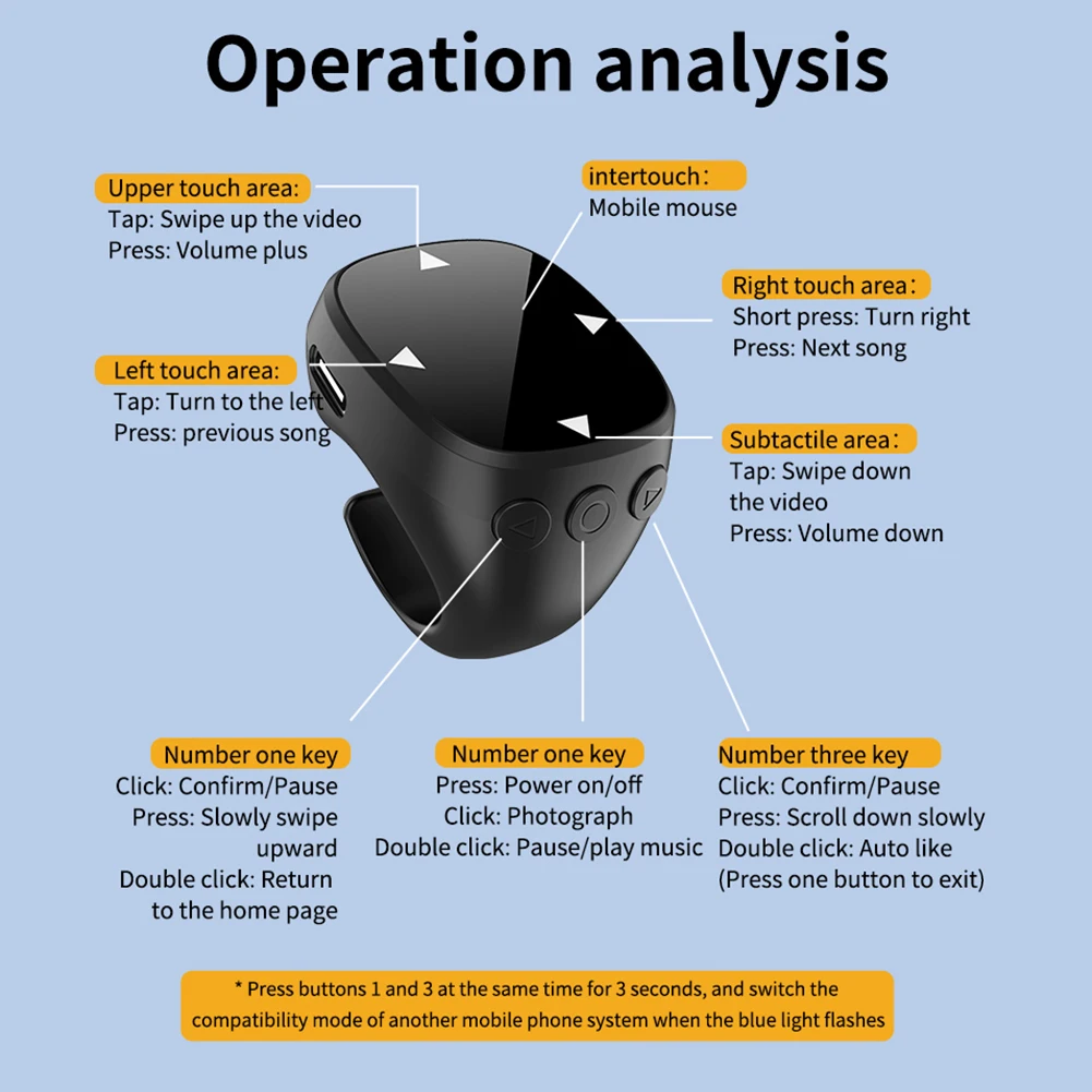 Feature: 1.Versatile Functionality: Supporting for short video apps and specific reading apps, this fingertip wireless remote control allows volume adjustment, truly freeing your hands. Also a selfie tool for capturing stunning photos while enjoying videos. 2.Premium Material: Crafted from high-quality ABS, this video scrolling remote control is drop-resistant, sweat-proof, and pressure-resistant, with a matte finish for a comfortable grip. 3.Wireless Control: Fully upgraded for seamless operation, this page turner scroller handles videos, photography, and e-books effortlessly. Browse presentations and scroll pages wirelessly for an enhanced experience. 4.Bluetooth-compatible 5.3: With advanced bluetooth-compatible connection technology, this finger remote offers stable usage up to a distance of 10 meters. 5.Ring Design: The mobile phone video remote features a compact, ergonomic design that fits snugly on fingers, preventing fatigue during extended use. Specification: Origin: Mainland China Product functions: short video page turning, page sliding up and down, e-book page turning, automatic click accumulation, photo shooting, video switching, song switching and pause, active mouse function Bluetooth version: Ver.5.3 Supported protocol: EDR+BLE Transmitting power: classII (-6dBm~+4dBm) Frequency (Hz): 2.40GHz~2.48GHz Bluetooth transmission distance: 10 meters Charging interface: Type-C Input current: DC5V Ring battery: 90mAh*1(401030) Continuous use time: 24 hours Charging time: about 1 hour Ring size: 39*36*31mm/1.54x1.42x1.22inch Packaging box size: 85*76.5*36mm Ring product weight: 13g Gross weight: 52g