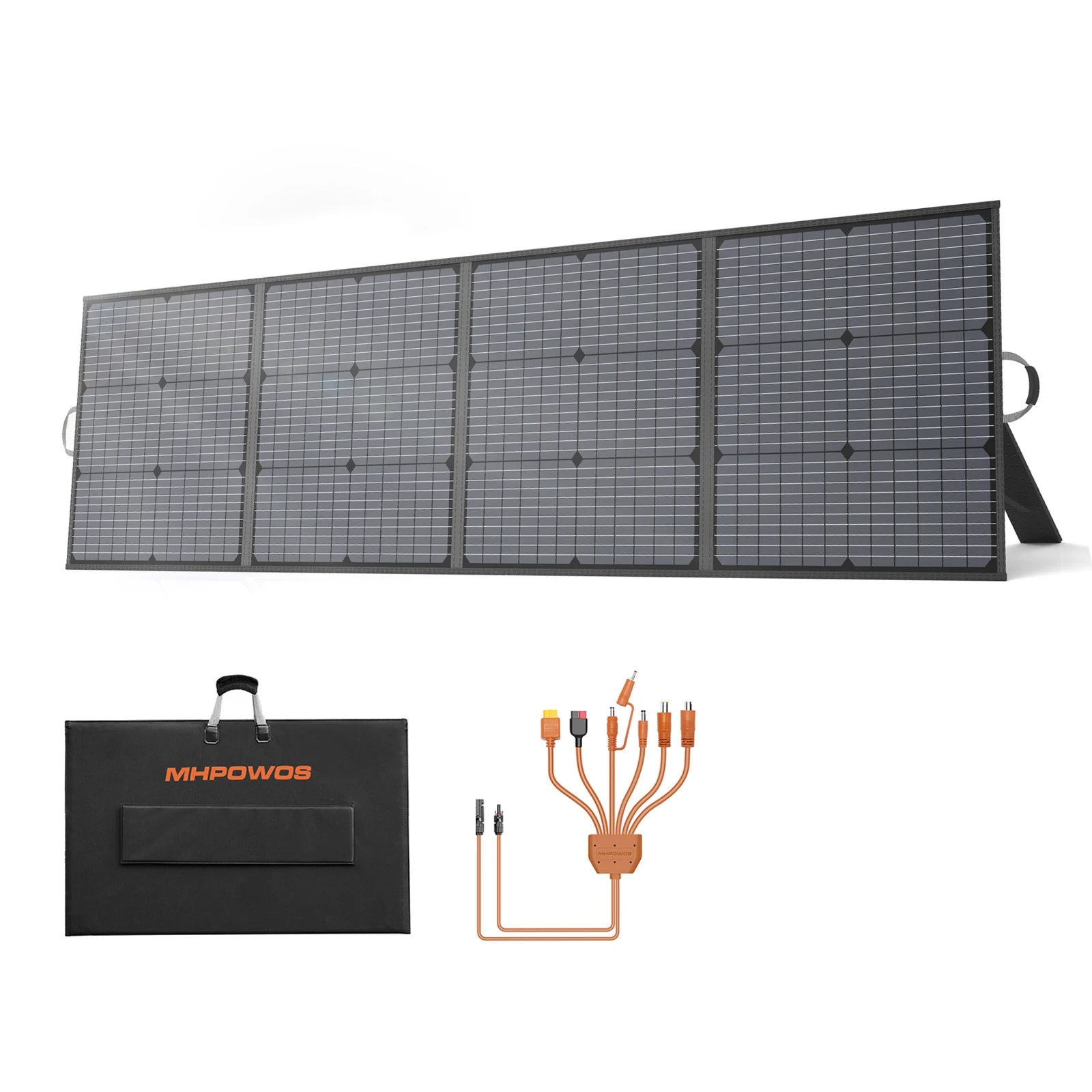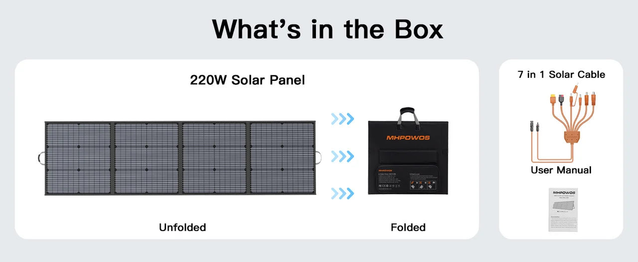 MHPOWOS 220W foldable and Portable solar panel, Solar Extension Cable to XT60, instruction manual, 18 months warranty and friendly customer service.