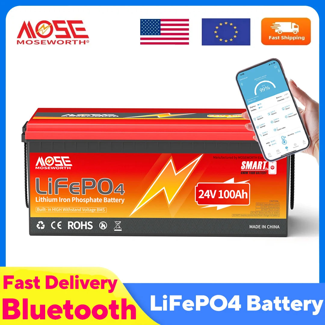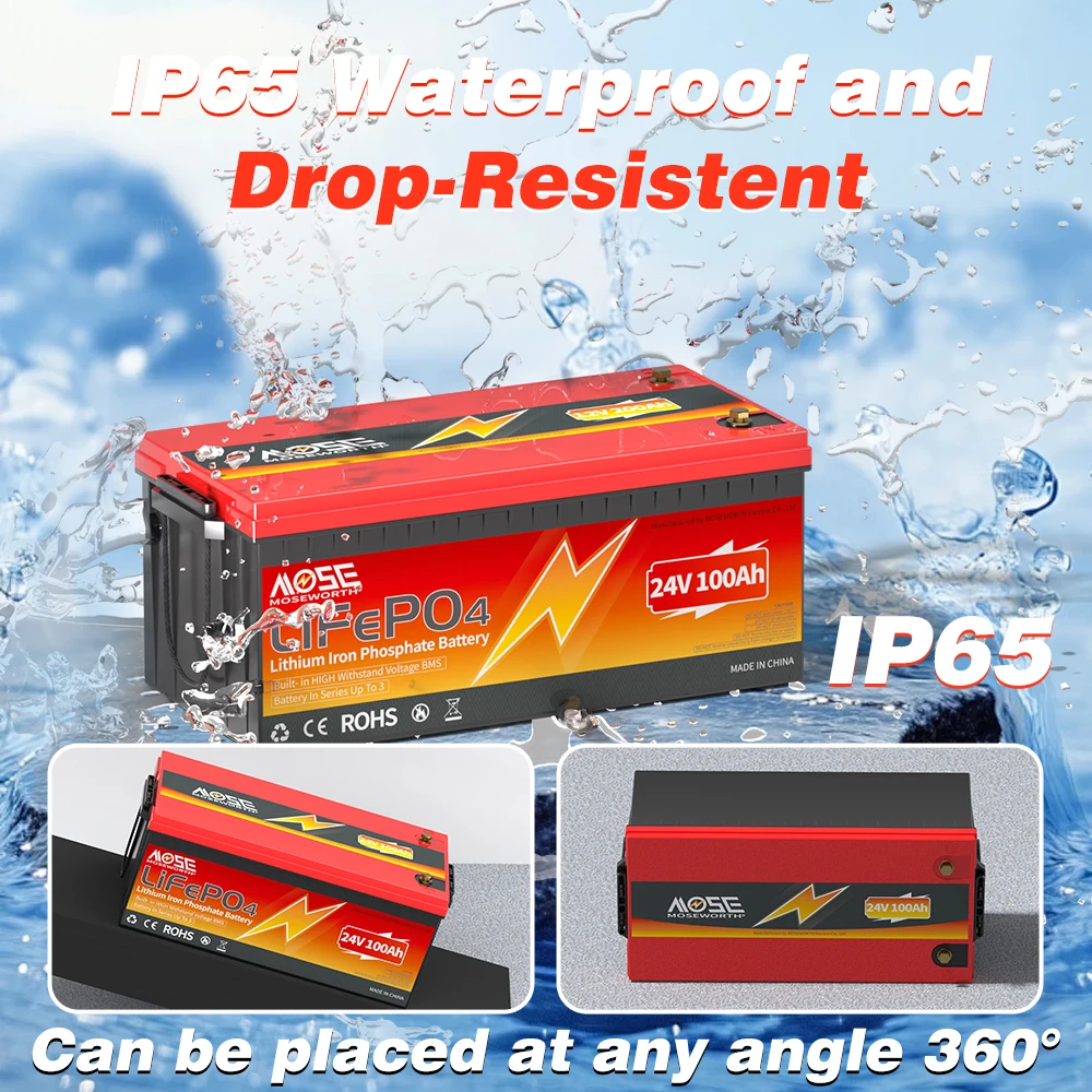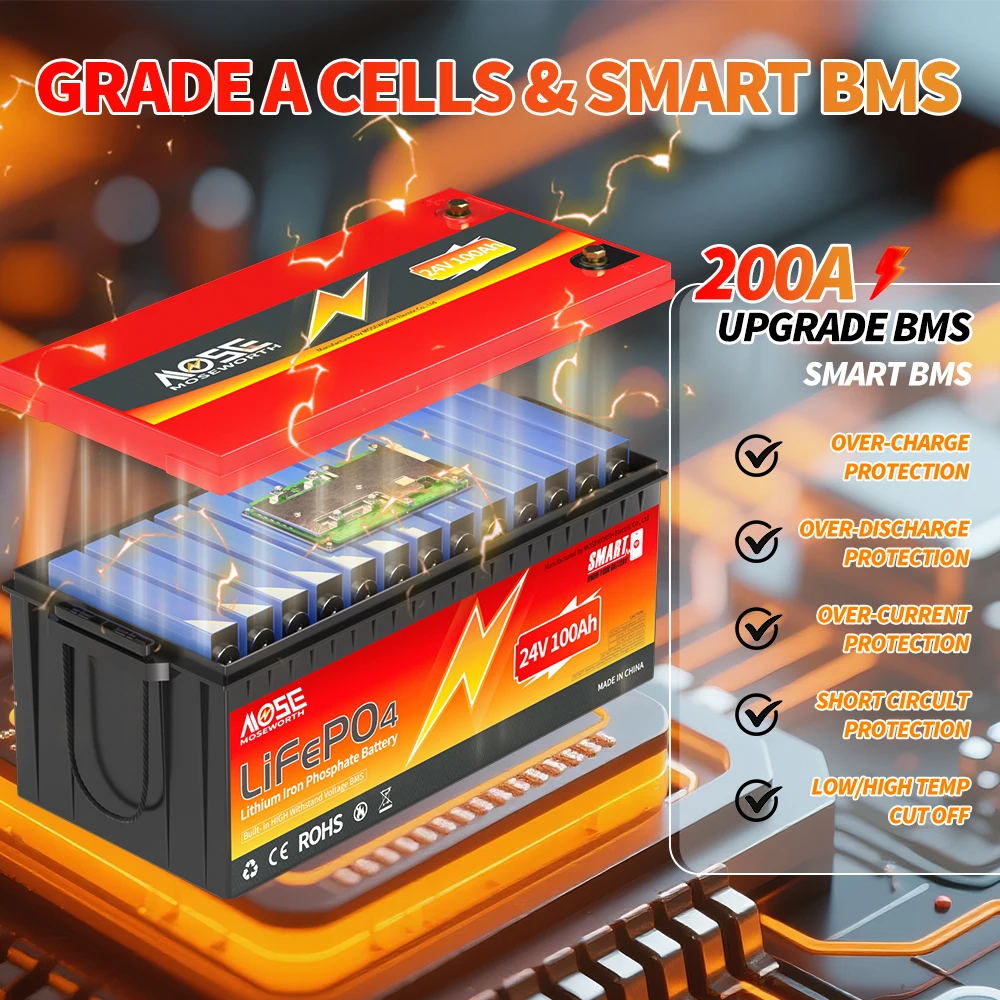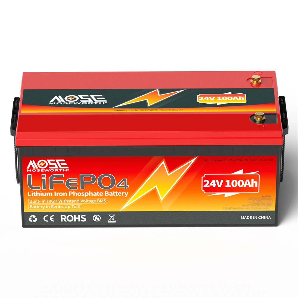 MOSEWORTH 24V 100Ah LiFePO4 Lithium Battery with 100A BMS 8000+ Deep Cycles Rechargeable Batteries for Campers Trolling Motor