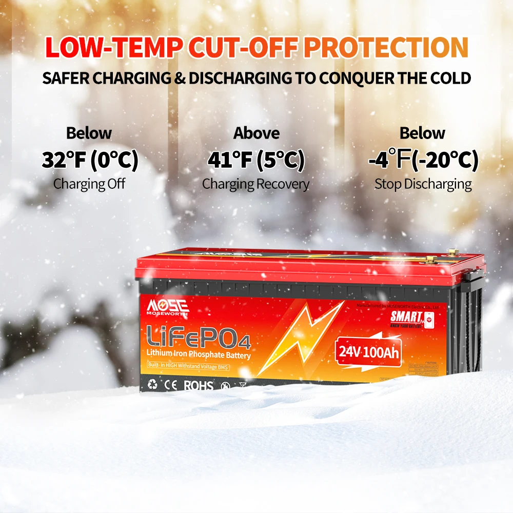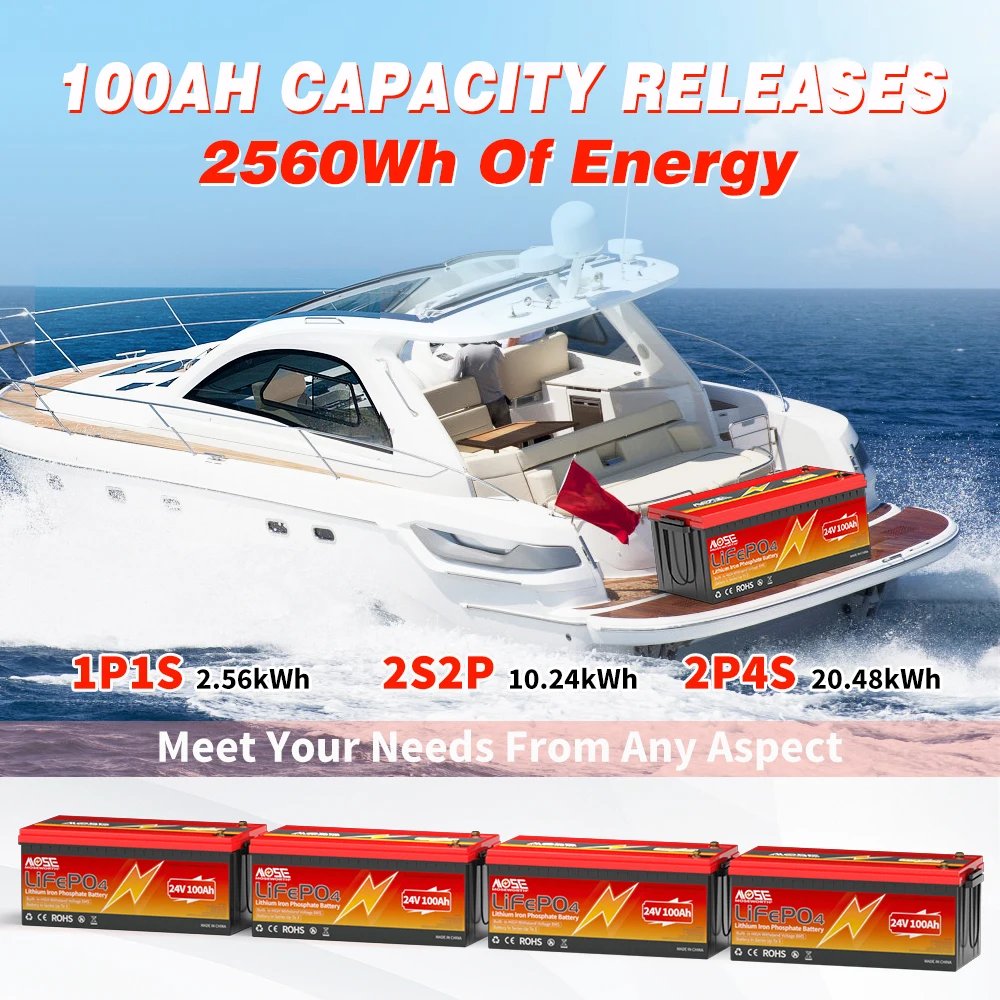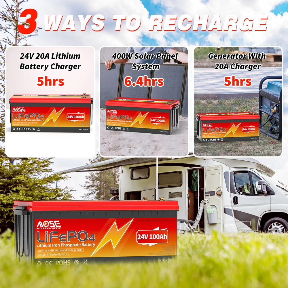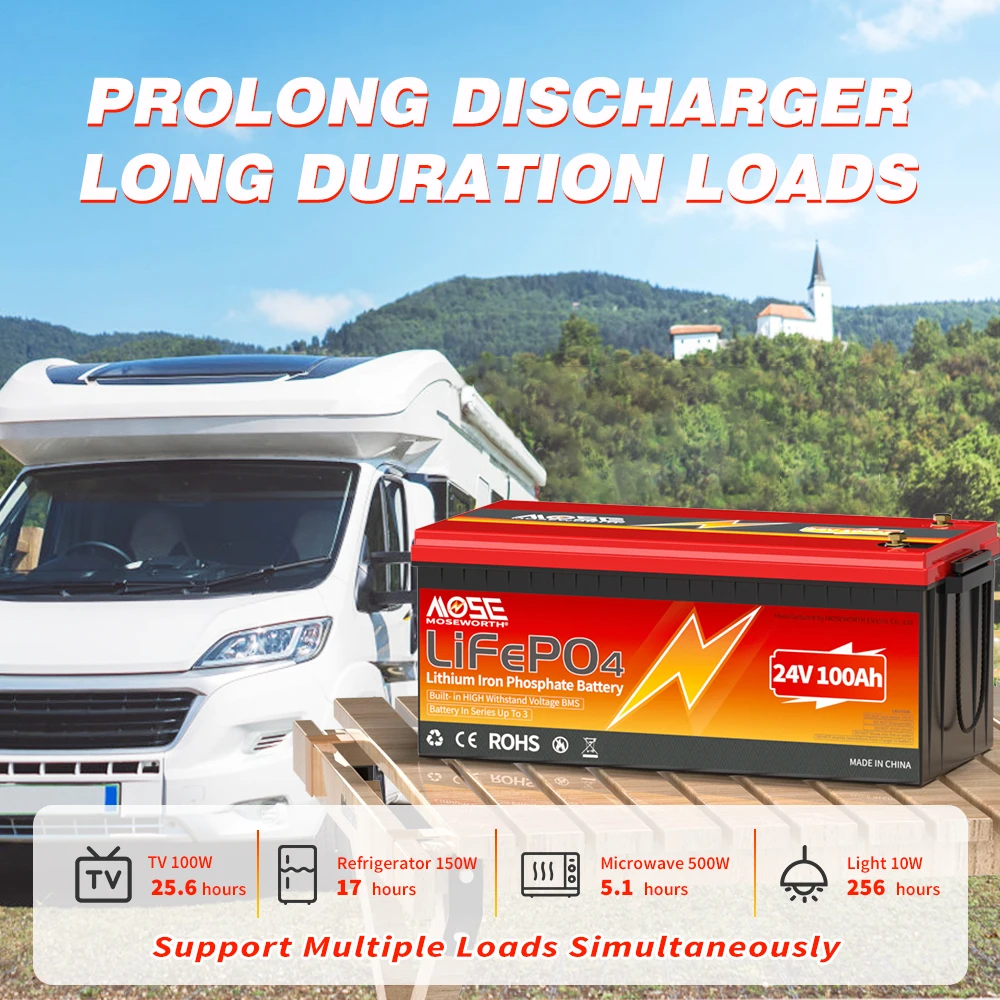 MOSEWORTH 24V 100Ah LiFePO4 Lithium Battery with 100A BMS 8000+ Deep Cycles Rechargeable Batteries for Campers Trolling Motor