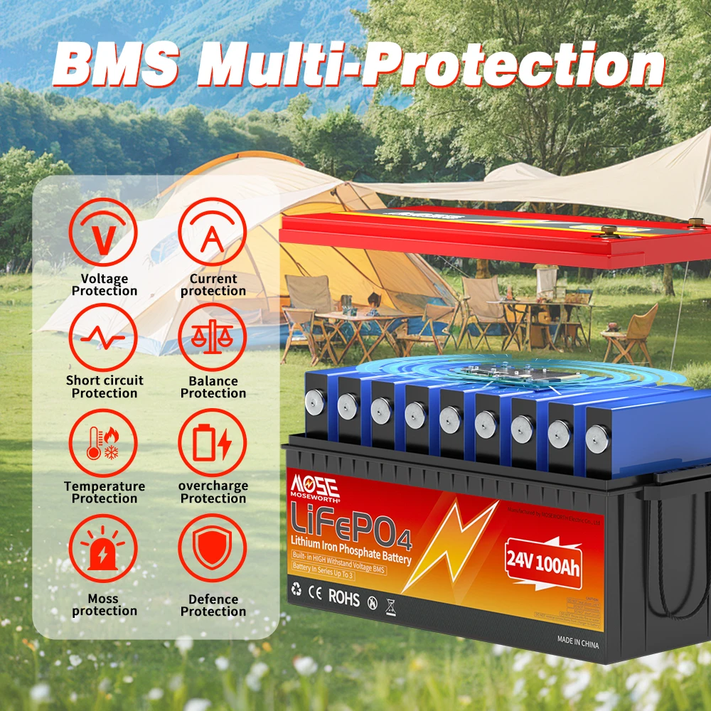 -MOSEWORTH newest lifepo4 battery used high version Series BMS panel, better performance in series/parallel. Also it has overcharge, overdischarge, overcurrent, short circuit low/high temperature cut-off protection. More easy to use and lower defective rate.