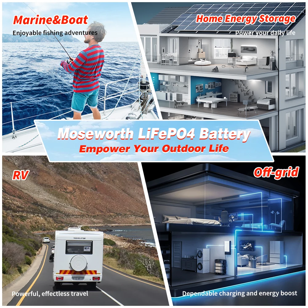 1. Lithium Iron Phosphate- MOSEWORTH's deep cycle lithium ion batteries have unlimited mounting capability, exceptional longevity, and are more cost effective.