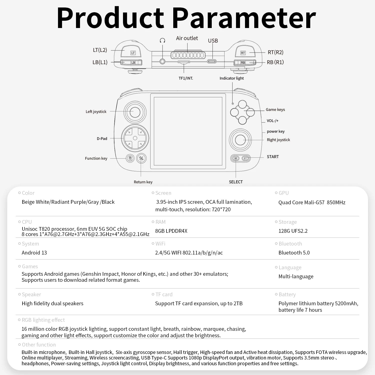 Other function: Built-in microphone,Built-in Hall joystick, Six-axis gyroscope sensor, Hall trigger, High-speed fan and Active heat dissipation, Supports FOTA wireless upgrade, Online multiplayer, Streaming, Wireless screencasting, USB Type-C Supports 1080p DisplayPort output, vibration motor, Supports 3.5mm stereo headphones, Power-saving settings, Joystick light control, Display brightness, and various function properties and free settings.