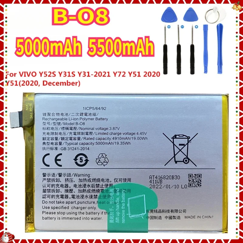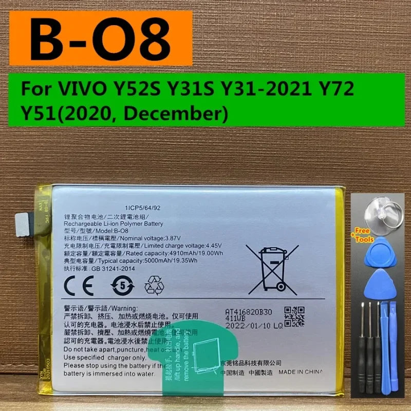 New B-O8 5000mAh Cell Phone Battery for Vivo Y52S Y53S Y31S Y31 (2021) Y72 Y51 (2020) Y51(2020, December) Replacement