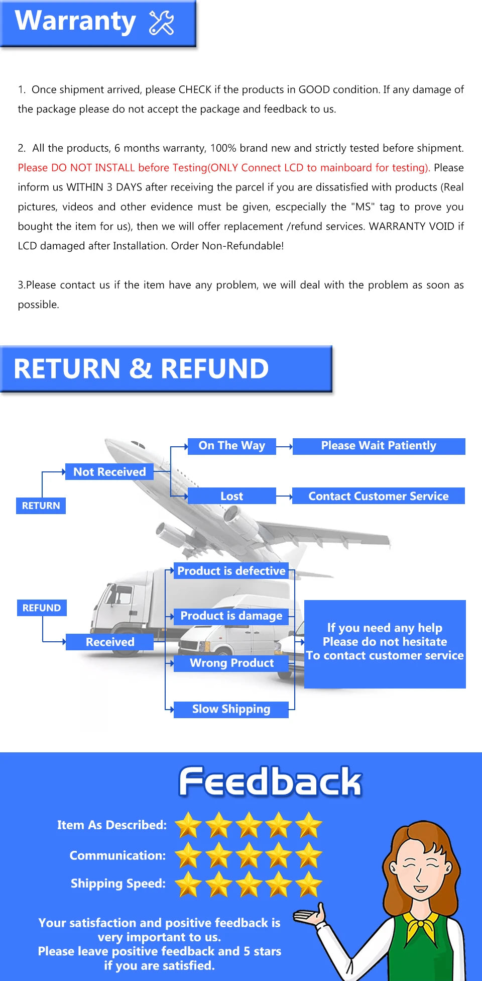 3.Delivery within 24 hours after payment is confirmed (except holidays), fast delivery. The quality can be guaranteed, and the product provides a 6-month warranty.