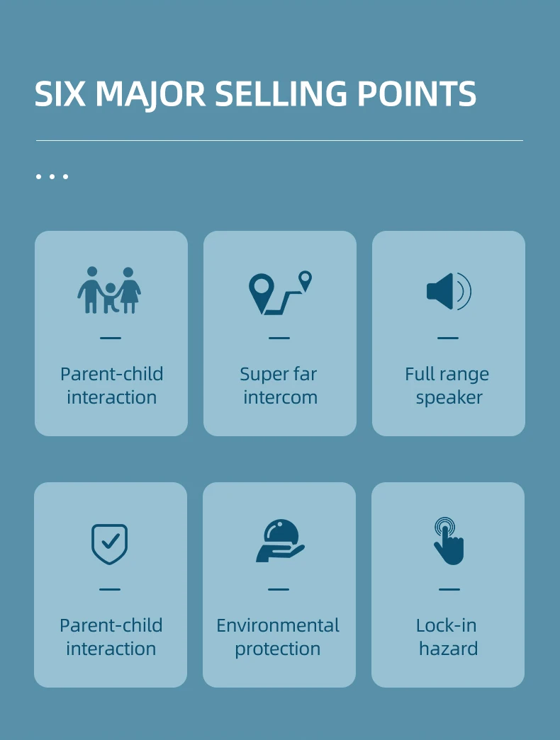 1.Parent-child interaction 2 Super far intercom 3 full range speaker 4 enviromental protection 5. Lock-in hazard 6. Parent-child interaction