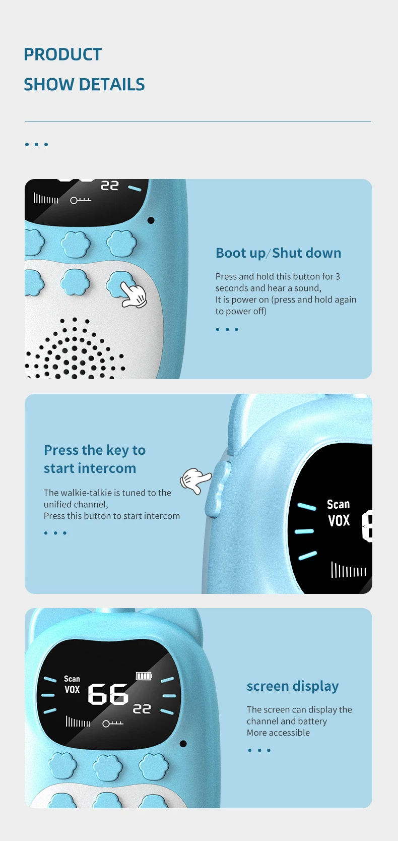 Product name:  walkie talkie, intercom distance:3km, use age: 3-12 years old  Material: ABS material