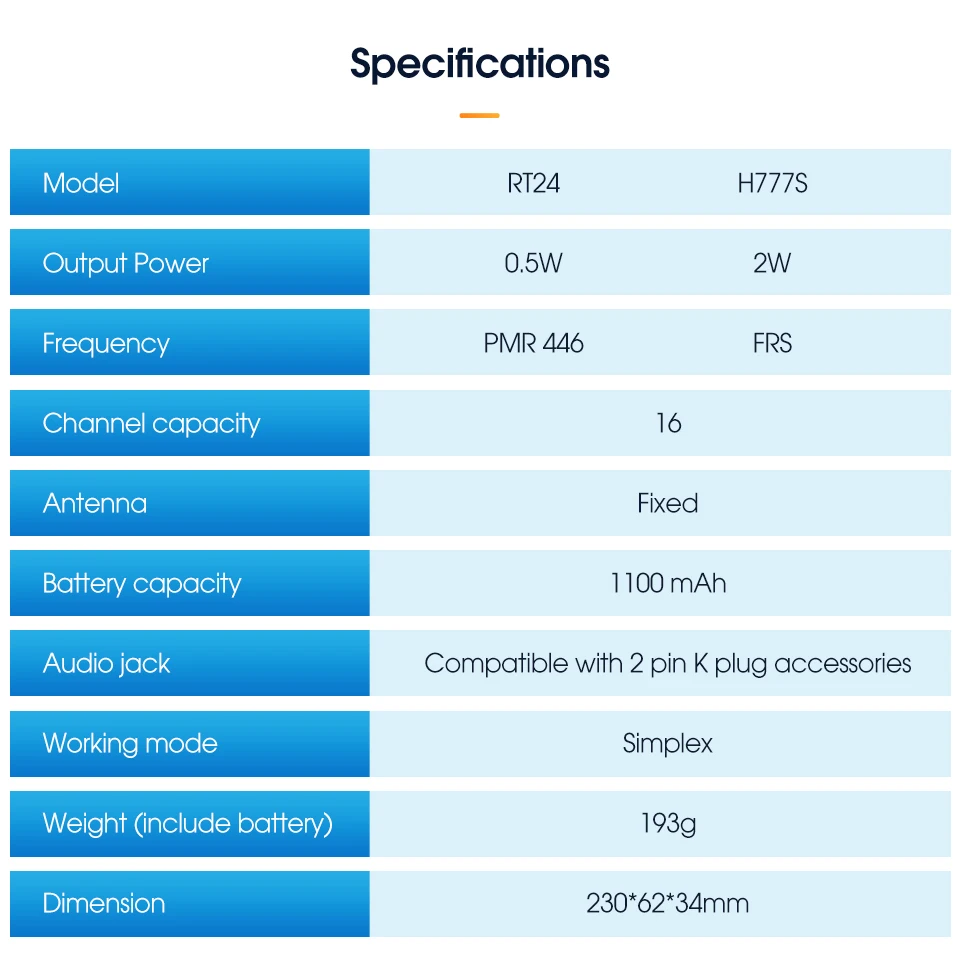 Frequency Range: RT24: 446 MHz or H777S:462MHz