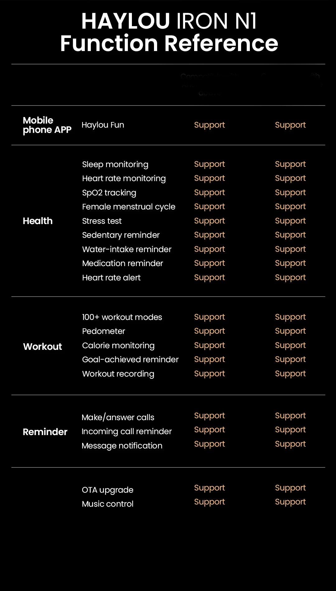 Bluetooth Calls / Make/Answer Calls / Incoming Call Reminder / Smart Message Notification / Practical gadgets / Voice Assistant / Bluetooth 5.3 / SOS Emergency Call / 100+ workout modes / Calorie monitoring / Pedometer / Goal-achieved Reminder / Workout Recording / OTA upgrade / Music control.