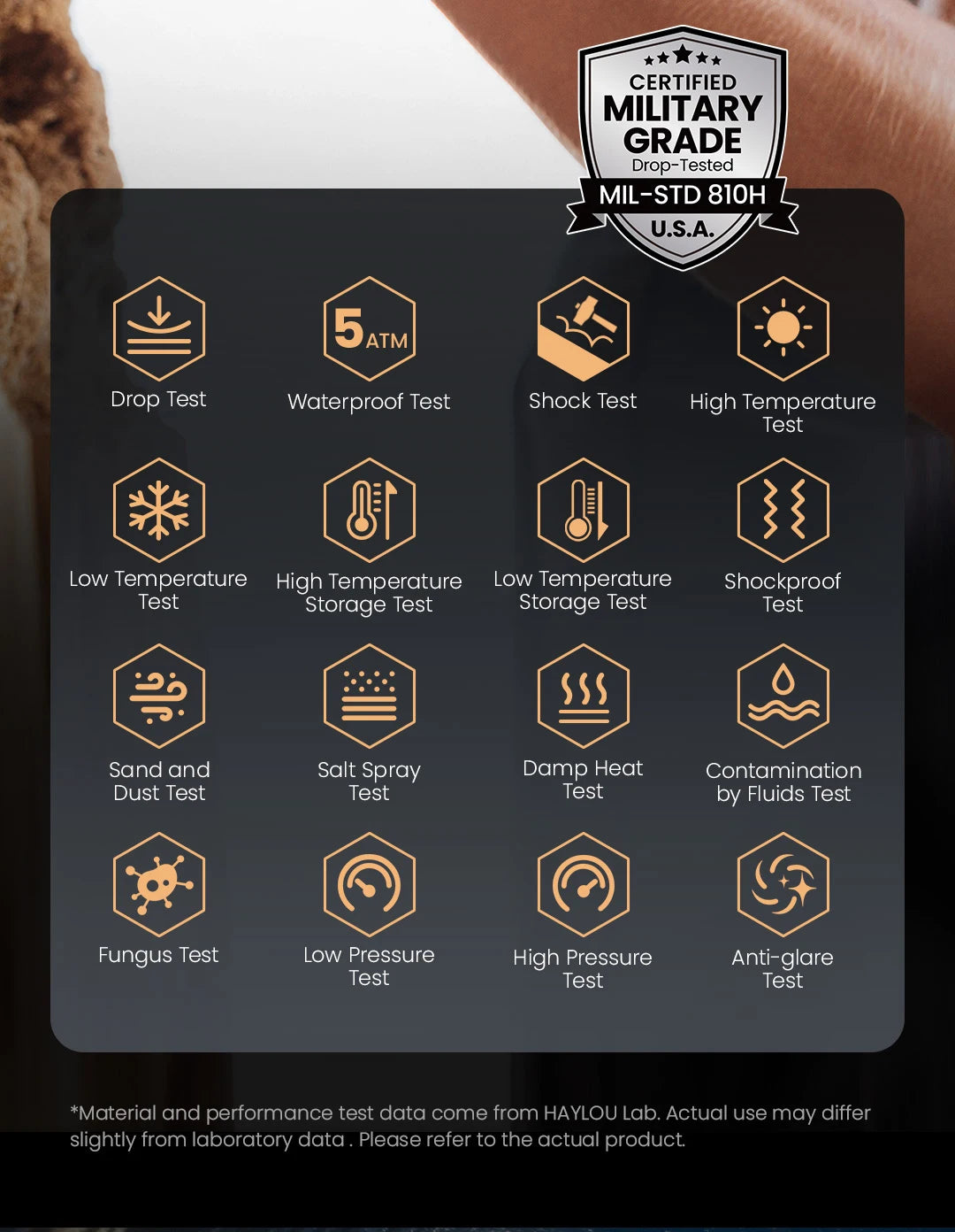 Drop Test / LOW Temperature Test / Sand and Dust Test / Fungus Test / Waterproof Test / High Temperature Storage Test / Salt Spray Test / Low Pressure Test / Shock Test / Low Temperature Storage Test / Damp Heat Test / High Pressure Test / High Temperature Test / Shockproof Test / Contamination by Fluids Test / Anti-glare Test
