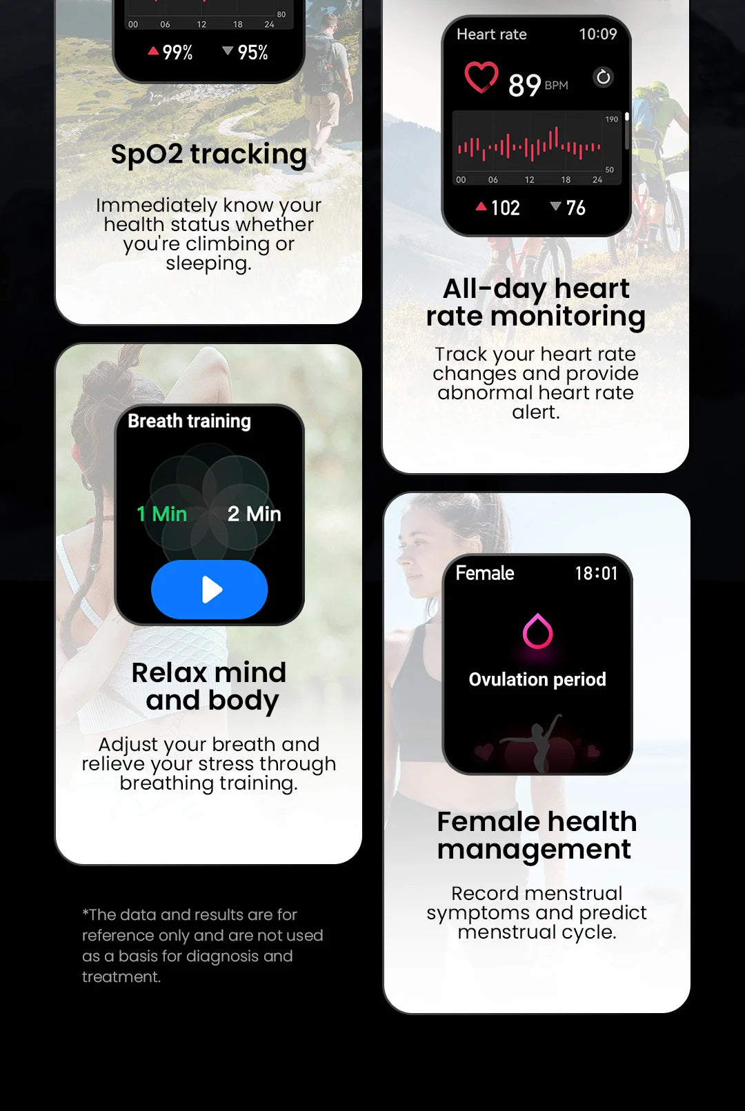 Sleep Monitoring / Heart Rate Monitoring / SpO2 Tracking / Female Menstrual Cycle / Stress Test / Sedentary Reminder / Water-intake Reminder / Medication Reminder / Heart Rate Alert/ Breathing Training