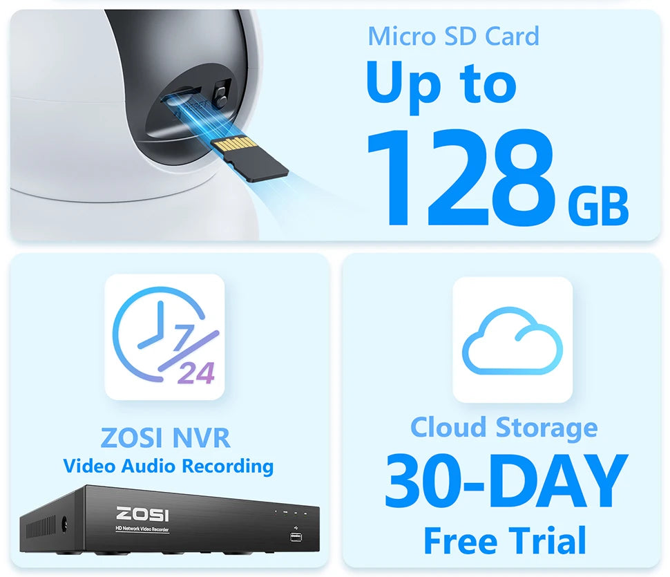 Store video on micro SD card(up to 128GB, not included), cloud storage or connect camera to NVR