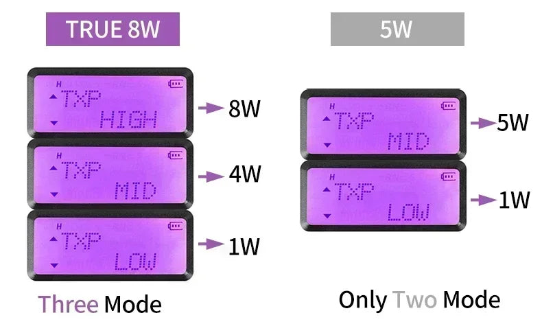 The UV-5R8W is the most powerful BaoFeng capable of transmitting 8 watts! Low/Medium/High three section TX power1W/4W/8W adjustable.