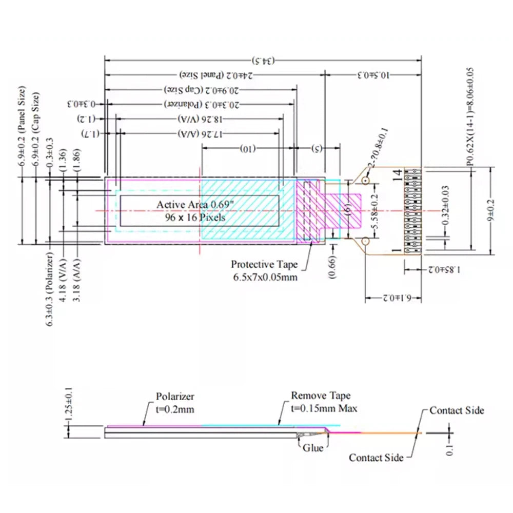 0.69 Inch OLED Display 96x16 Resolution Monochrome LCD Screen 14pin Interface SSD1312 Driver Soldering Model