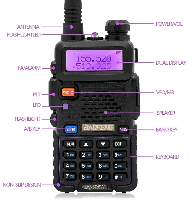 The UV-5R8W is the most powerful BaoFeng capable of transmitting 8 watts! Low/Medium/High three section TX power1W/4W/8W adjustable.