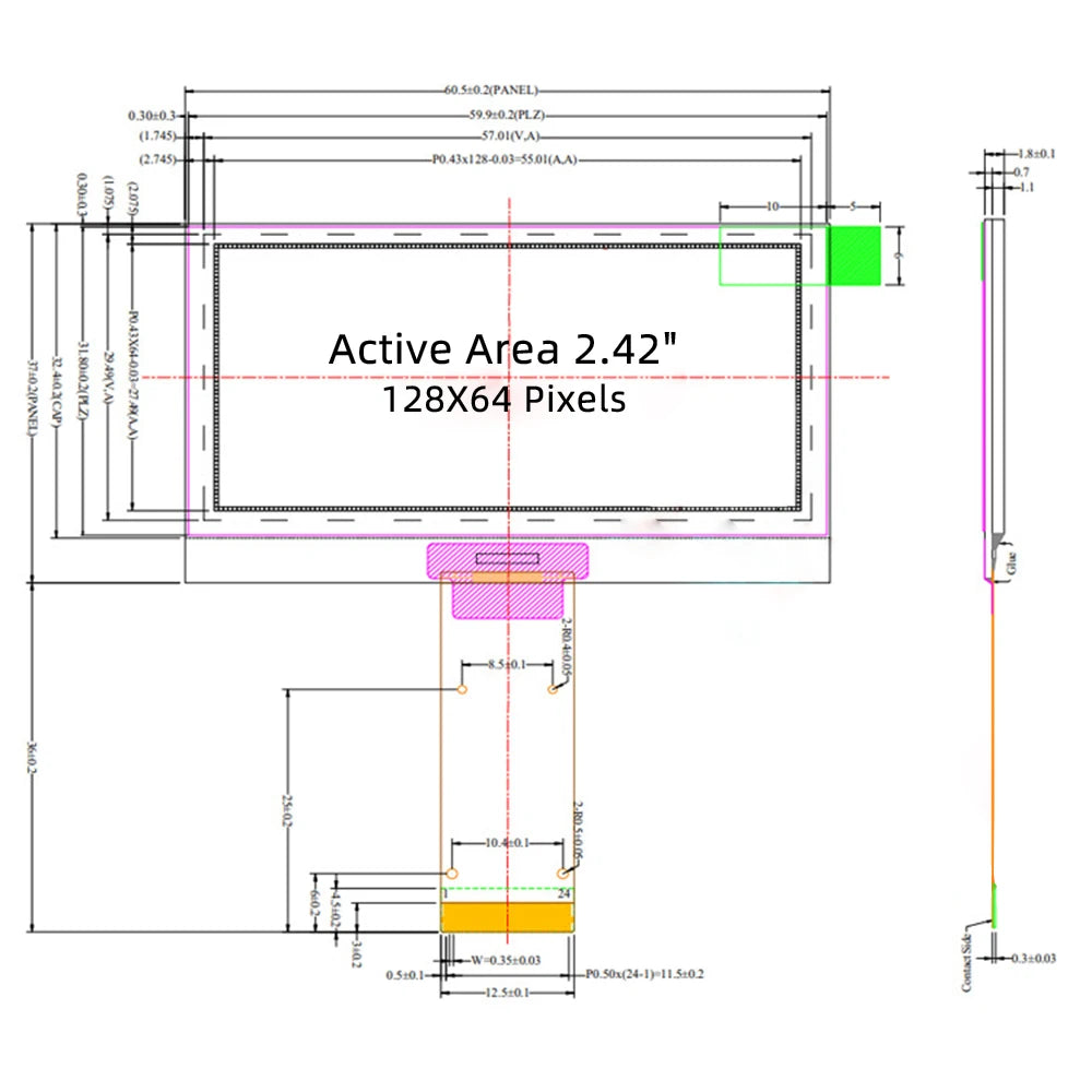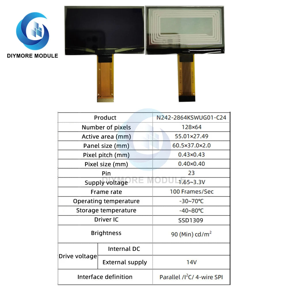 2.42 1.54 Inch OLED Monochrome Display SSD1309 Resolution 23pin SPI Dot Matrix 128*64 Yellow/Blue/Green/White LCD Screen