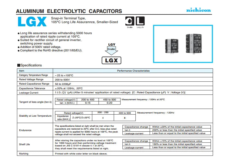 2Pcs/10Pcs 100uF 500V Nichicon GX/LQ 22x40mm 500V100uF Snap-in PSU Capacitor LGX2H101MELZ40