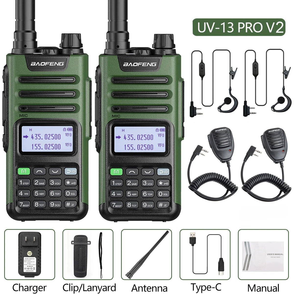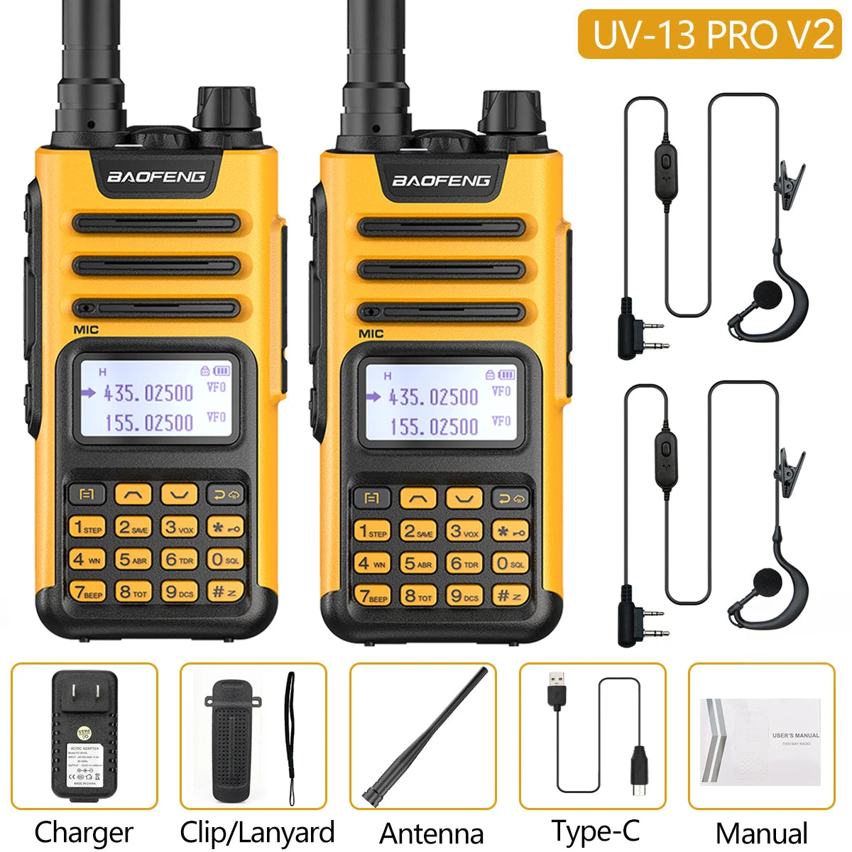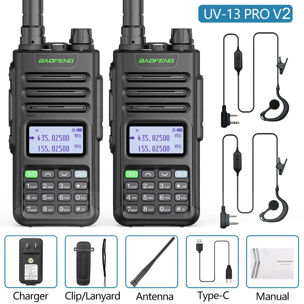 2PCS BAOFENG UV13 Pro V2 10W Waterproof Walkie Talkie UHF/VHF Dual Band UV13PRO with Typ-C Cable Upgrade of UV-10R Two Way Radio