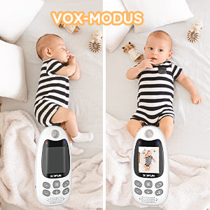 In VOX mode (with adjustable sensitivity), our video baby monitor automatically switches to standby mode to save power. The screen is automatically activated when there are sounds in the baby's room.